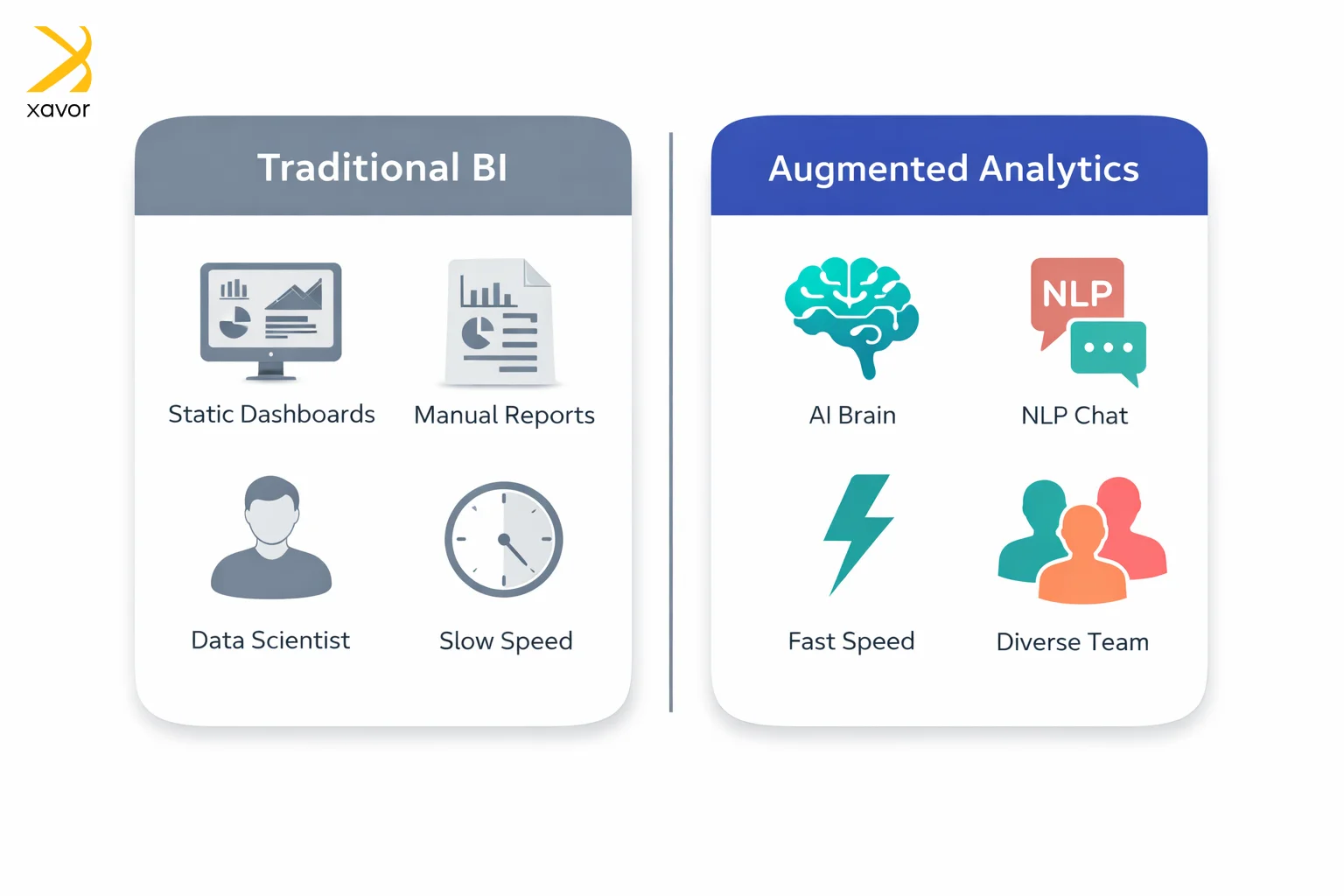 Pagrindinis skirtumas yra tas, kad pažangiajai analitikai dažnai reikia kvalifikuotų analitikų arba duomenų mokslininkų, kad galėtų paleisti modelius ir interpretuoti rezultatus. Papildyta analizė palengvina šį procesą naudojant AI įrankiaimašininis mokymasis ir automatizavimas, kad būtų galima atlikti didžiąją dalį sunkių darbų. Tai leidžia verslo vartotojams tyrinėti duomenis, užduoti klausimus paprasta kalba ir greičiau gauti įžvalgų visiškai nepriklausant nuo techninių komandų.